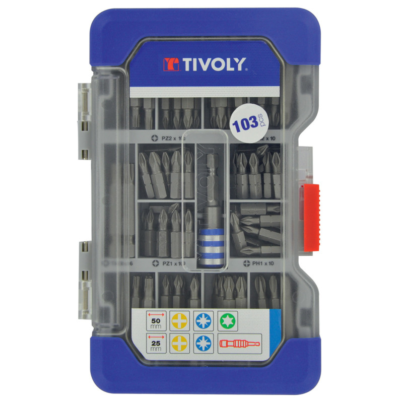La mallette Ranger TIVOLY de 103 pièces offre un assortiment complet d'embouts de vissage de 25 et 50 mm. Ce coffret contient les empreintes adaptées à la plupart des vis du marché, pesant 1.182 kg.