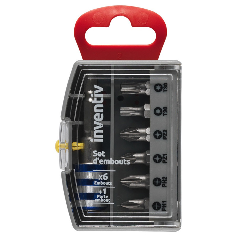 Le set d'embouts de vissage avec porte-embout 6 pièces comprend des embouts PH/PZ/TX. Ce coffret d'embouts INVENTIV offre une solution complète pour vos travaux de vissage.