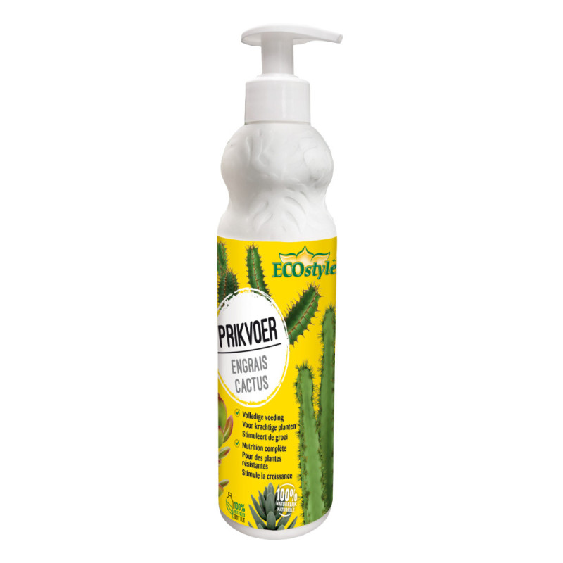 L'engrais liquide ECOSTYLE pour cactus et plantes grasses, d'une contenance de 0,4 L, est formulé à base de vinasse et convient à l'agriculture biologique. Son dosage précis, via une pompe doseuse, recommande deux pressions pour 500 ml d'eau afin d'apporter les nutriments nécessaires, avec un ratio NPK de 4-2,5-4.