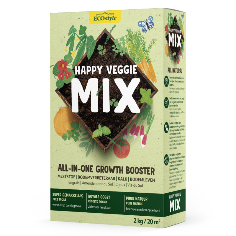 Le Happy Veggie Mix d'ECOstyle constitue une solution intégrée pour la fertilisation du potager. Ce produit combine un engrais organo-minéral avec des amendements, de la chaux douce et des micro-organismes bénéfiques. Sa formule NPK 4-3-3 assure une nutrition équilibrée, favorisant à la fois le développement végétatif et la fructification des plantes.