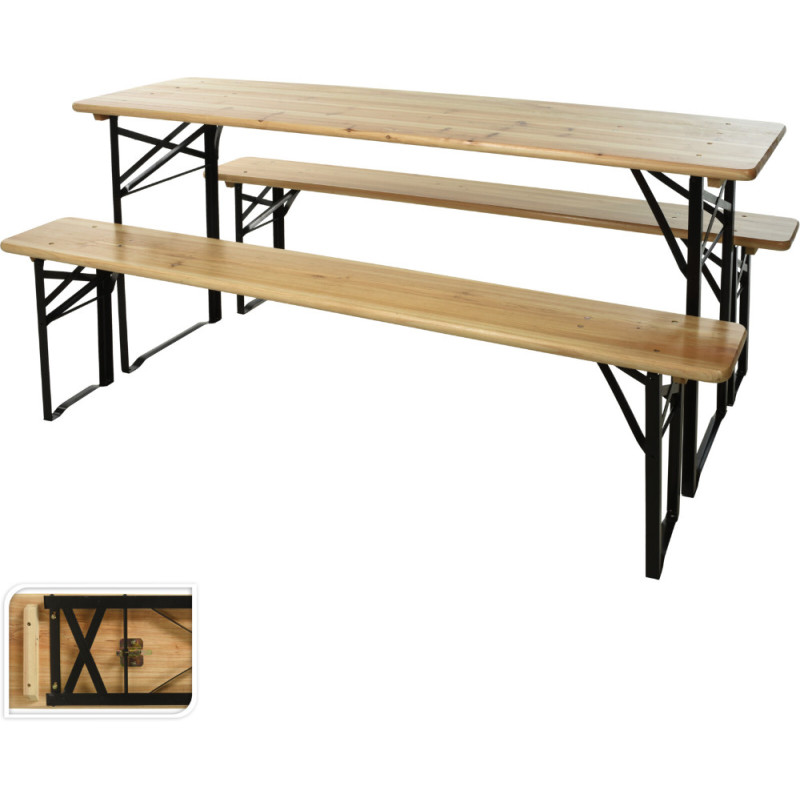 Cet ensemble de jardin brasseur comprend une table et deux bancs en bois massif FSC 100% de type Cunninghamia, montés sur une structure en métal. La table mesure 180 x 50 x 75 cm et chaque banc supporte une capacité maximale de 250 kg.