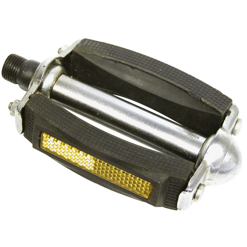 Le Jeu de pédales de vélo classique 2 pièces est conçu pour s'intégrer harmonieusement à tout équipement cycliste standard. Ces pédales présentent une esthétique bicolore, alliant le noir et l'argent, et sont dotées d'une surface texturée pour une adhérence optimale. La conception intègre des surfaces réfléchissantes dorées sur les côtés, améliorant la visibilité et ajoutant une touche fonctionnelle.