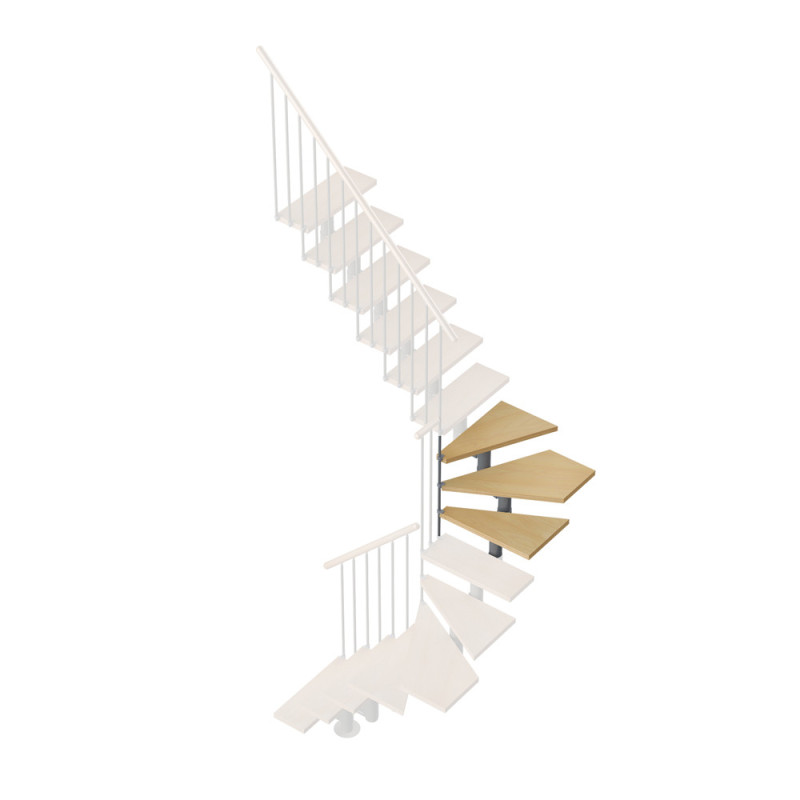 Ce composant permet la réalisation d'un escalier en configuration en "U" avec un double quart tournant. Il s'agit d'un élément de trois marches supplémentaires qui s'intègre au système existant pour modifier la trajectoire de l'escalier. Son utilisation est réservée à des installations fixes et nécessite une mise en œuvre par des professionnels.