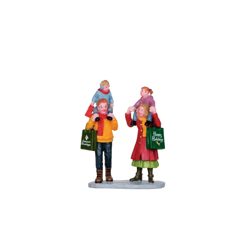 Parfaite pour compléter la décoration de votre village de Noël miniature, cette figurine représente une famille qui fait ses achats de Noël. La famille est composée des parents qui portent sur leurs épaules un petit garçon et une petite fille.
