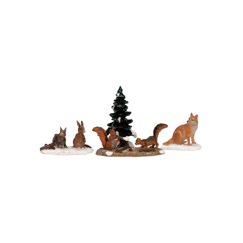 Réalisé et peint à la main, ce set de 4 pièces est composé d'une figurine avec 2 lapins, d'une figurine avec 2 écureuils, d'un figurine avec un renard et d'une figurine avec un sapin enneigé. Ces éléments de la marque Lemax trouveront parfaitement leur place dans la conception de votre village de Noël traditionnel. Leur présence accentueront l'aspect réaliste de votre village tout en apportant de la vie.