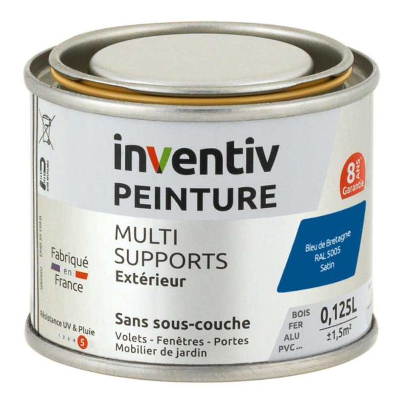 La peinture multi-supports de la marque Inventiv est une solution prête à l'emploi pour l'extérieur. Elle offre un rendement de 12 m²/L sur bois, métal et plastique, avec un temps de séchage complet de 12 heures.
