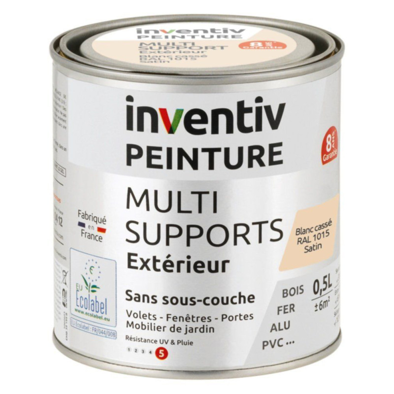 La peinture multi-supports de la marque Inventiv, d'une contenance de 0,5 L, offre une finition satinée blanc cassé. Idéale pour l'extérieur, elle s'applique sur bois, métal et plastique, couvrant 12 m²/L avec un temps de séchage de 12 heures.
