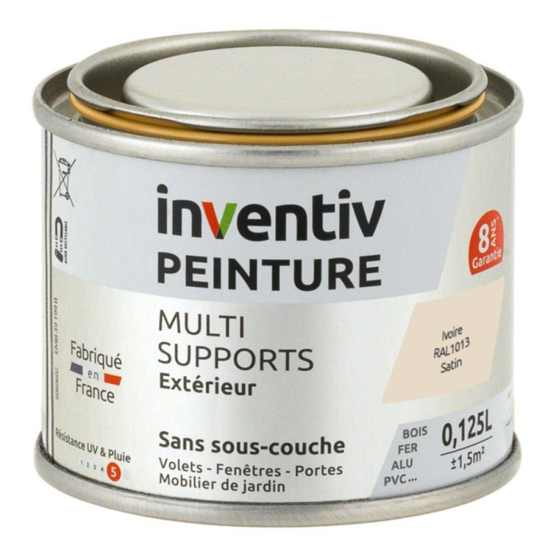 La peinture multi-supports de la marque Inventiv, contenue dans un pot de 0,125 L, s'applique au pinceau sur bois, métal et plastique. Sa finition satinée offre un rendement de 12 m²/L pour l'extérieur.
