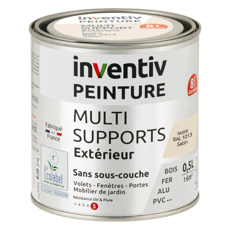 La peinture multi-supports de la marque Inventiv, de couleur ivoire, offre un rendement de 12 m²/L. Idéale pour bois, métal et plastique en extérieur, elle sèche complètement en 12 heures.
