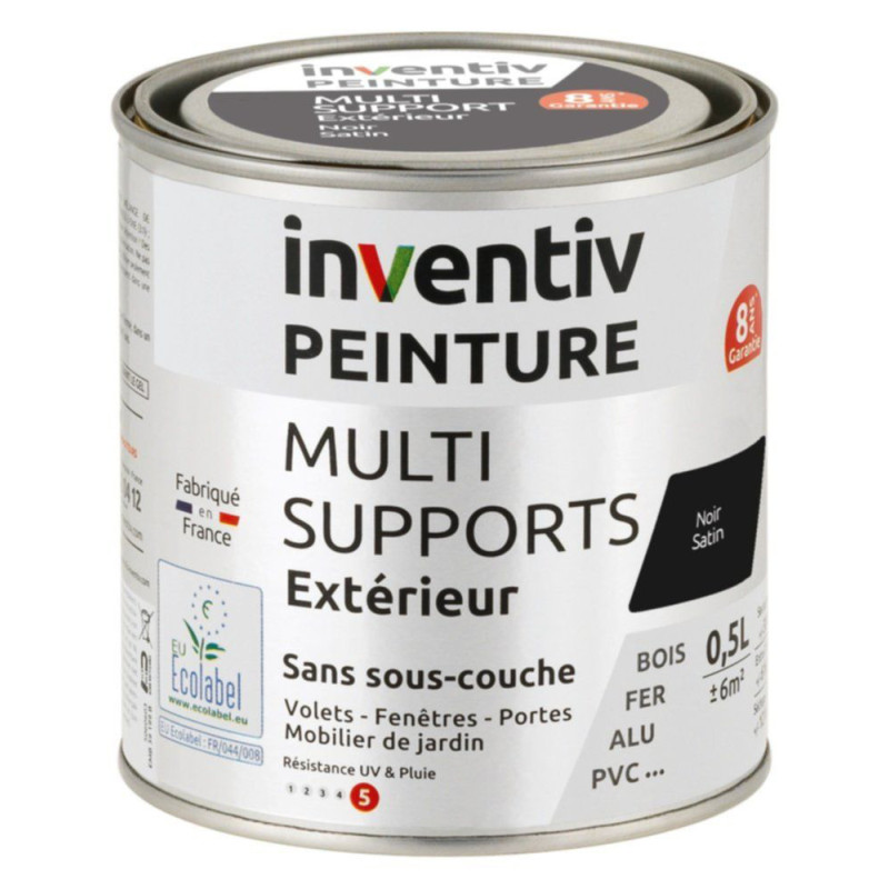 La peinture multi-supports de la marque Inventiv, prête à l'emploi, offre une finition satinée pour vos projets extérieurs. Sa formule liquide s'applique au pinceau sur bois, métal et plastique, couvrant 12 m²/L. Le séchage complet intervient en 12 heures.