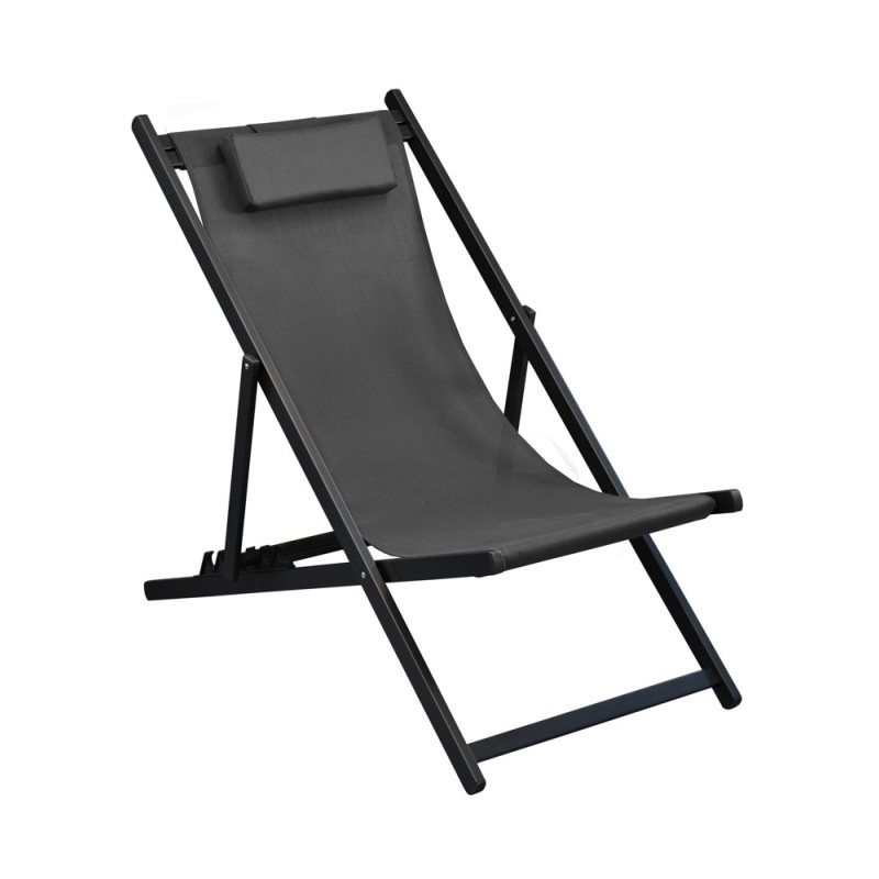 La chilienne Ara graphite possède une armature en aluminium peint et une toile technique TPEP résistante aux intempéries. Son dossier s'ajuste par crémaillère en 4 positions et supporte un poids maximal de 120 kg.