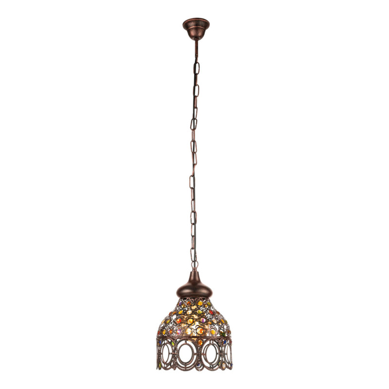 Cet abat-jour est combiné avec des billes de verre colorées et une chaîne à maillons, qui complètent de manière habile le design singulier de ce luminaire. Les découpages et les ornements en billes créent un magnifique jeu de lumières et de couleurs dès que la lampe est allumée.