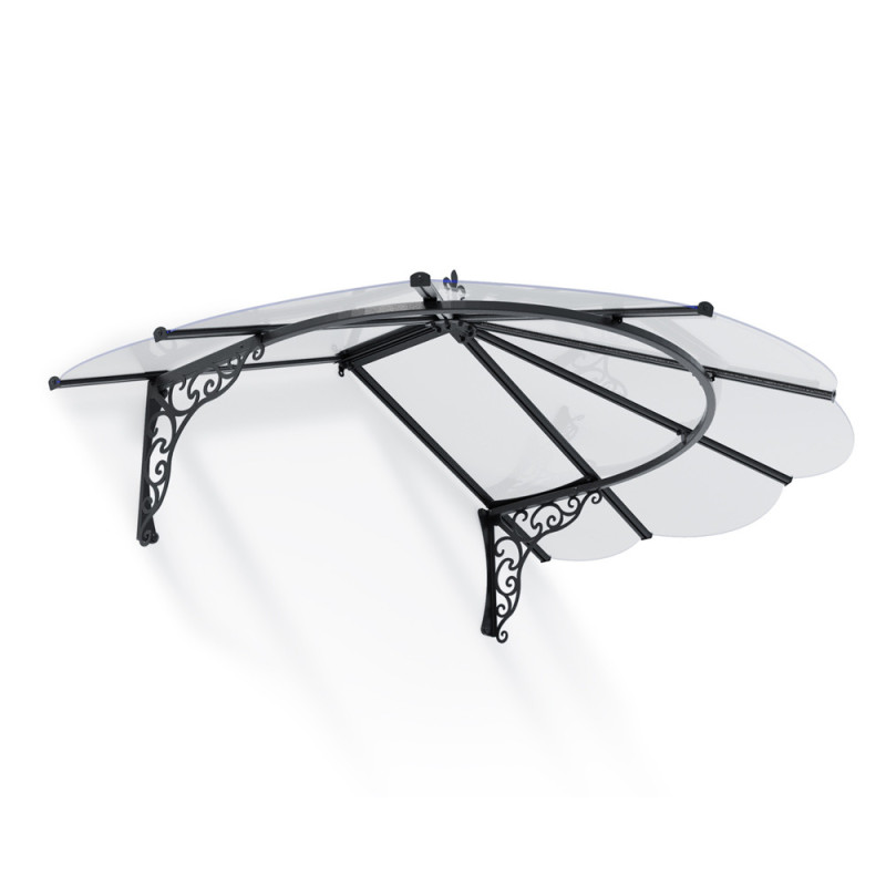 La marquise de porte Iris noire CANOPIA, de 174,9 x 125 cm, protège vos entrées. Ses panneaux en polycarbonate de 4 mm et sa structure en aluminium avec supports en acier galvanisé assurent durabilité et résistance aux intempéries.