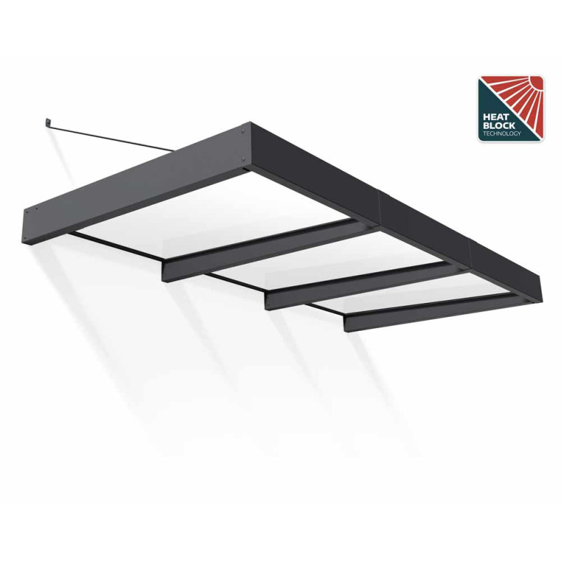 La marquise de porte Sophia XL gris foncé CANOPIA, en aluminium et acrylique opale 4 mm, offre une protection optimale contre les UV, la pluie et la neige. Sa structure résiste aux vents jusqu'à 120 km/h et supporte 200 kg/m² de neige, assurant durabilité et esthétisme.