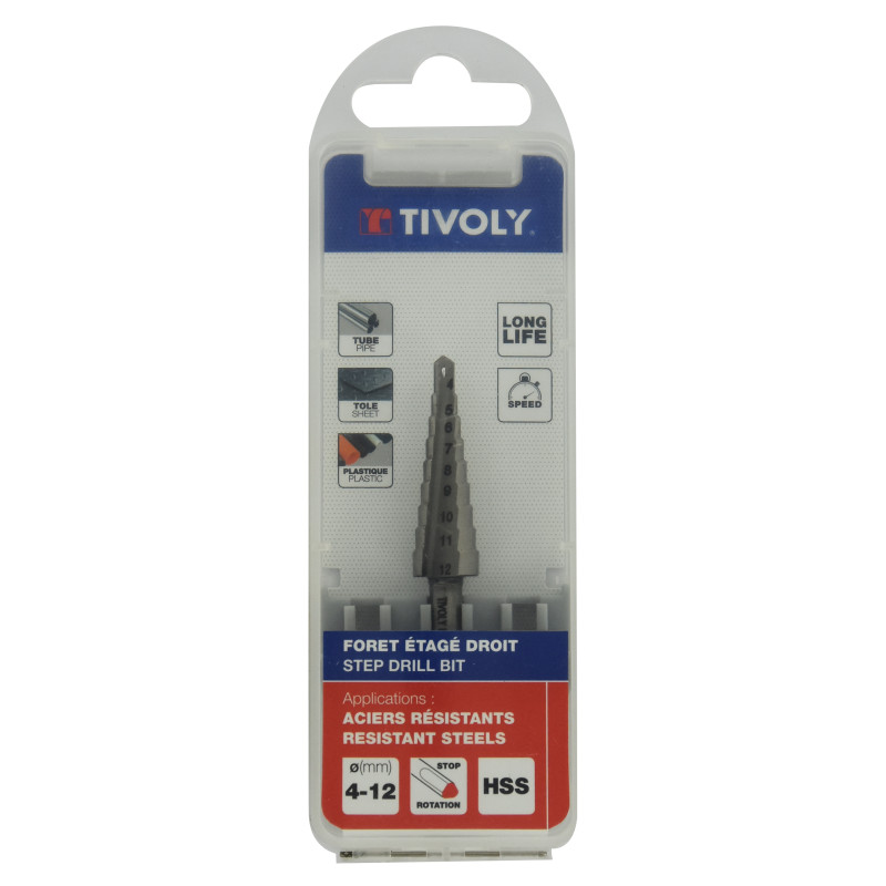 Le Foret HSS conique étagé pour métal Ø 4 - 12 mm de la marque TIVOLY représente une solution de perçage avancée. Cet outil est conçu pour offrir une grande précision lors de vos travaux. Sa conception spécifique permet une progression fluide et contrôlée, essentielle pour des résultats impeccables sur divers matériaux.