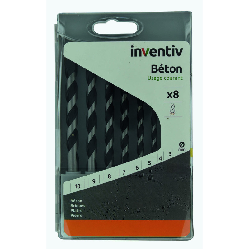 Le coffret de forets pour béton de la marque Inventiv comprend 8 pièces de diamètres de 3 à 10 mm. Ces forets sont conçus pour percer efficacement le béton, la brique, le plâtre et la pierre.