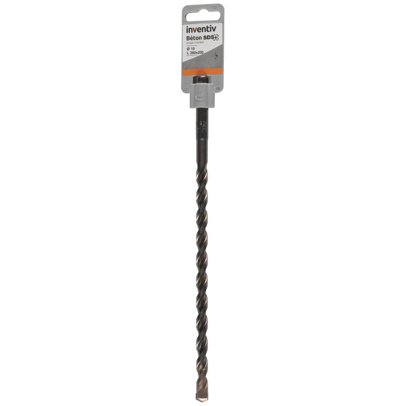 Le foret SDS pour béton est un outil de la marque Inventiv conçu pour les applications de perçage dans les matériaux de construction durs. Son diamètre nominal est de 10 millimètres, une dimension standard pour la fixation d'ancrages et de chevilles de taille moyenne. La longueur totale de 260 millimètres offre une profondeur de perçage adaptée à la plupart des besoins courants en maçonnerie. Ce foret est fourni à l'unité, permettant une intégration immédiate dans la boîte à outils de l'artisan ou du bricoleur.