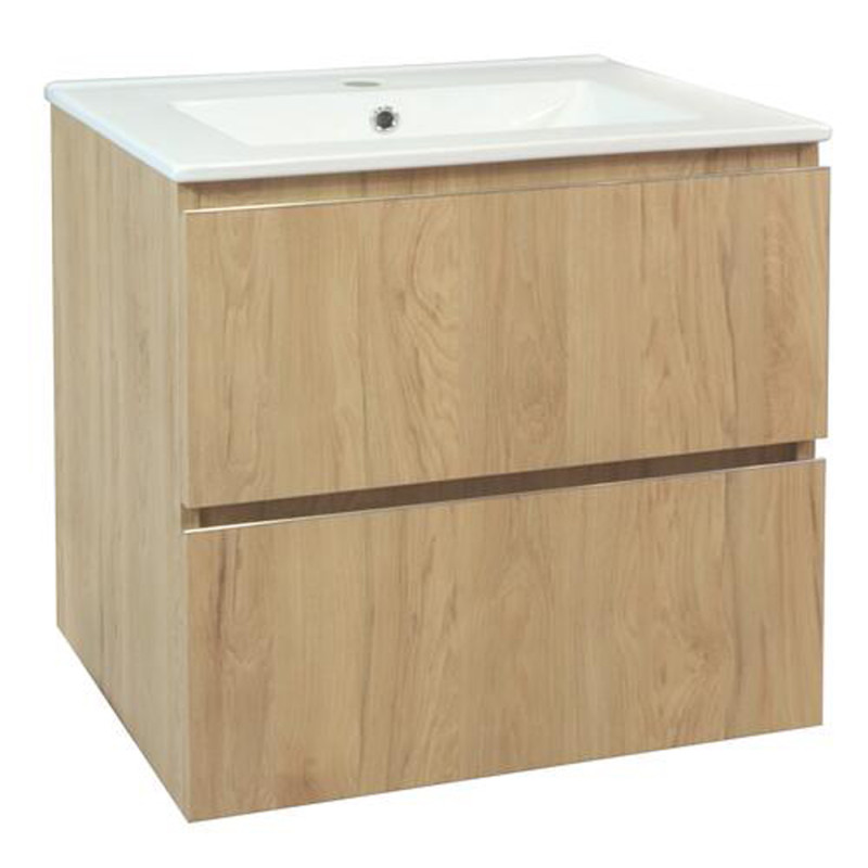 Moderne et épuré, le meuble de salle de bain Trendy de la marque Ondée bénéficie de deux grands tiroirs avec fermeture soft-close et d'une vasque en céramique blanche. Ce modèle de couleur bois mesure 61,5 cm de largeur, 60 cm de hauteur et 46,5 cm de profondeur.