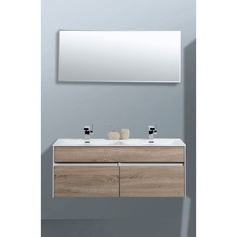L'ensemble de salle de bain SANIMAR Roma 120 cm associe un meuble blanc brillant à des façades en chêne gris. Il intègre un lavabo double vasque en polybéton et un miroir, avec des tiroirs équipés d'une fermeture douce pour un usage silencieux.
