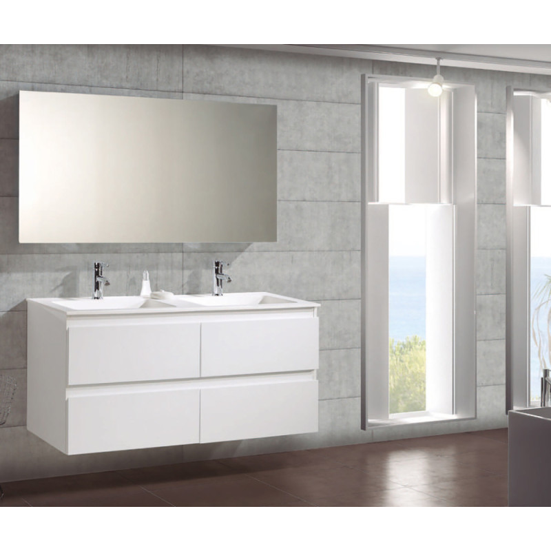 Le meuble de salle de bain Valentina en blanc mat de 120 cm intègre une vasque en céramique brillante et quatre tiroirs à fermeture progressive pour un rangement fonctionnel. Cet ensemble complet avec miroir, conçu pour une pose suspendue, offre une solution esthétique et pratique.