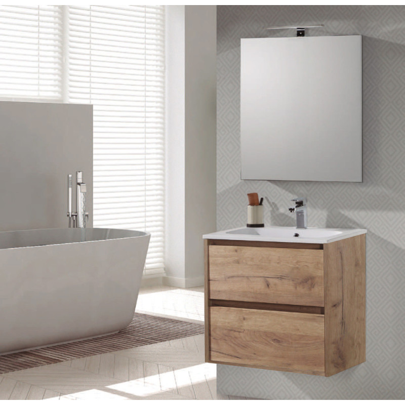 L'ensemble de salle de bain Melanie chêne constitue une solution complète pour organiser l'espace. Il intègre un meuble de salle de bain suspendu, une vasque en céramique blanche brillante et un miroir, offrant ainsi une base d'aménagement immédiatement opérationnelle. Sa conception répond aux exigences d'une pièce humide, avec des matériaux sélectionnés pour leur durabilité et leur facilité d'entretien.