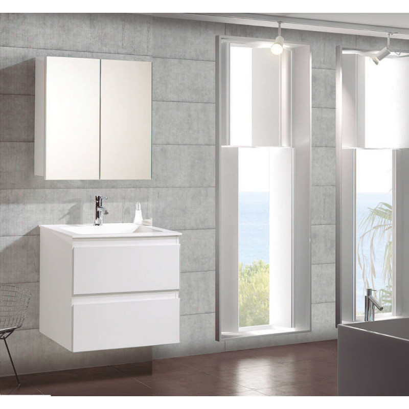 L'ensemble de salle de bain Valentina Plus en blanc brillant intègre un meuble sous-vasque suspendu de 80 cm avec deux tiroirs et une armoire de toilette. Sa vasque en céramique résistante et son fini laqué moderne en font une solution complète pour l'aménagement.