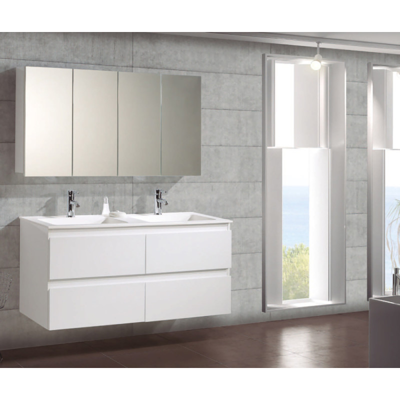 L'ensemble de salle de bain Valentina Plus THYS en blanc mat de 120 cm intègre une vasque en céramique brillante et une armoire de toilette avec miroir. Sa conception suspendue et ses quatre tiroirs à fermeture douce offrent un rangement optimisé et une installation simplifiée.