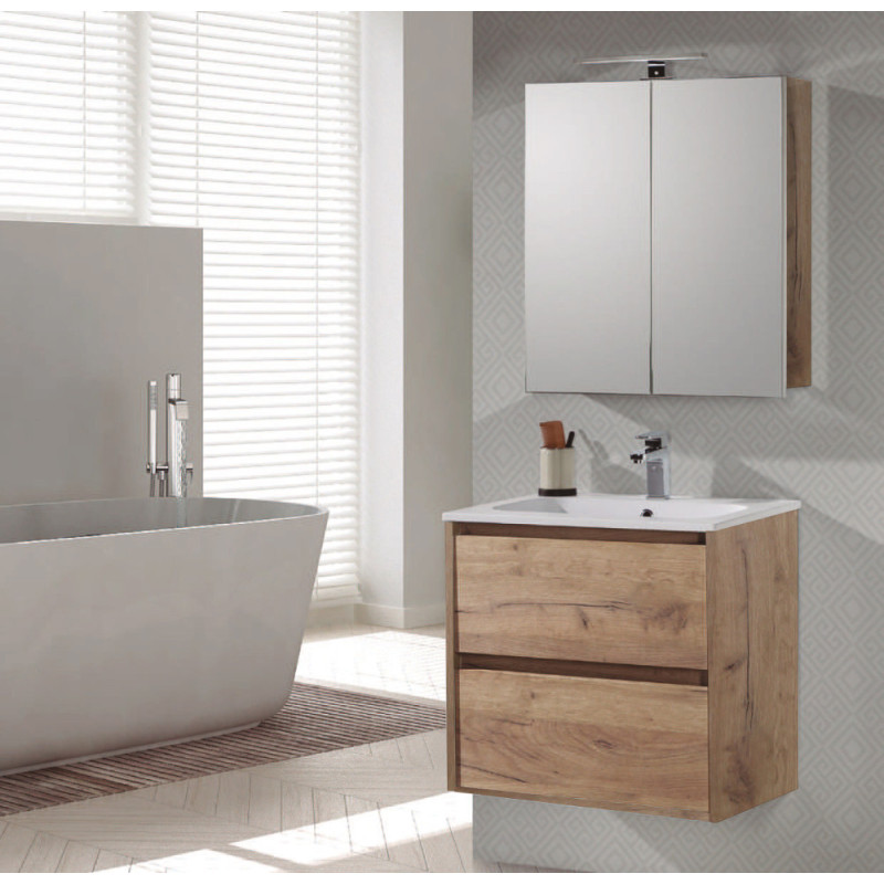 L'ensemble de salle de bain THYS Melanie Plus intègre une vasque en céramique brillante sur un meuble suspendu en chêne de 80 cm. Il offre un rangement pratique avec ses deux tiroirs et une armoire de toilette complémentaire.