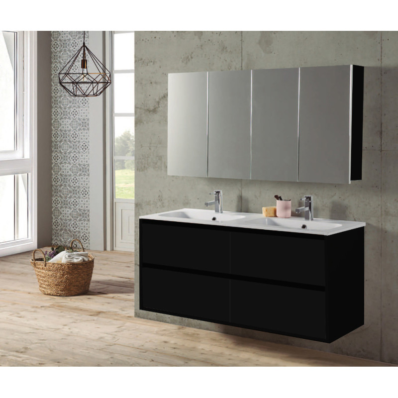 L'ensemble de salle de bain THYS Melanie Plus en noir 120 cm intègre un meuble suspendu avec quatre tiroirs spacieux et une vasque en céramique blanche. Son fini mélaminé résistant et son armoire de toilette complètent cet aménagement fonctionnel.