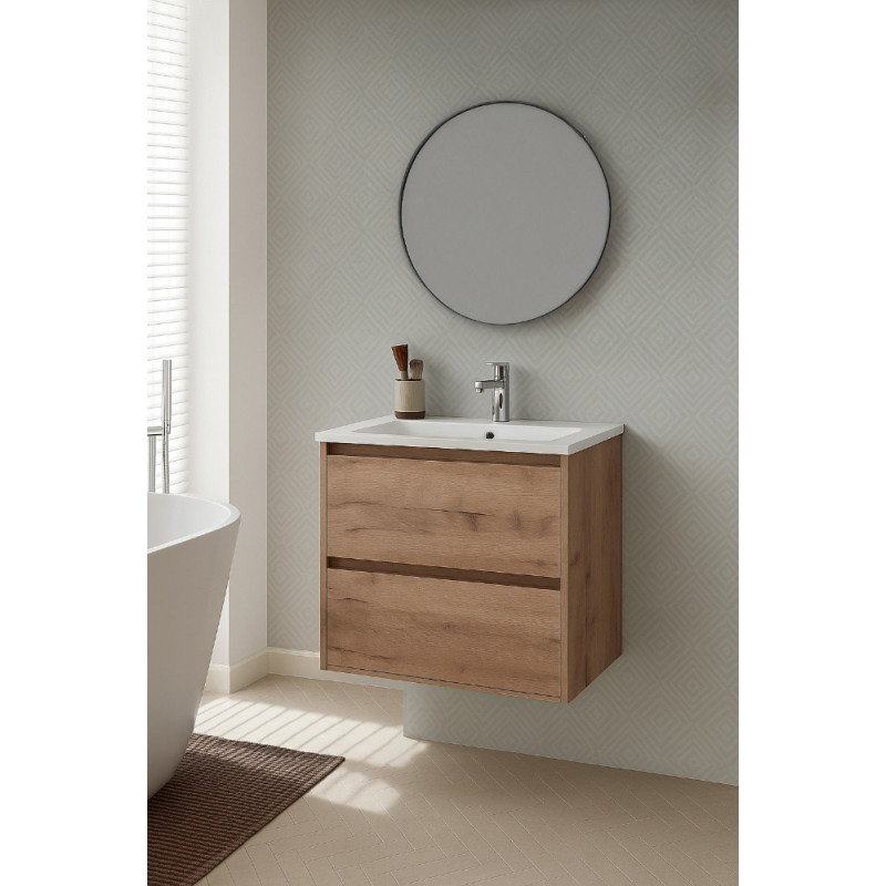 Le meuble sous plan Melanie en chêne de 60 cm THYS, à suspendre, propose un rangement pratique avec ses deux tiroirs à fermeture progressive. Son design en chêne mélaminé et sa structure en aggloméré s'intègrent dans une salle de bains moderne.