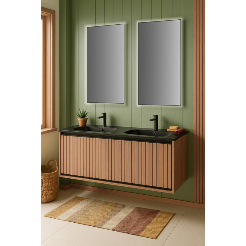 Conçu pour une installation suspendue, ce meuble de salle de bain présente un format généreux avec une largeur de 120 cm et une profondeur de 46 cm. Sa structure est prête à recevoir une vasque et une robinetterie grâce à un perçage prévu à cet effet. Les fixations nécessaires pour une pose murale sécurisée sont incluses.