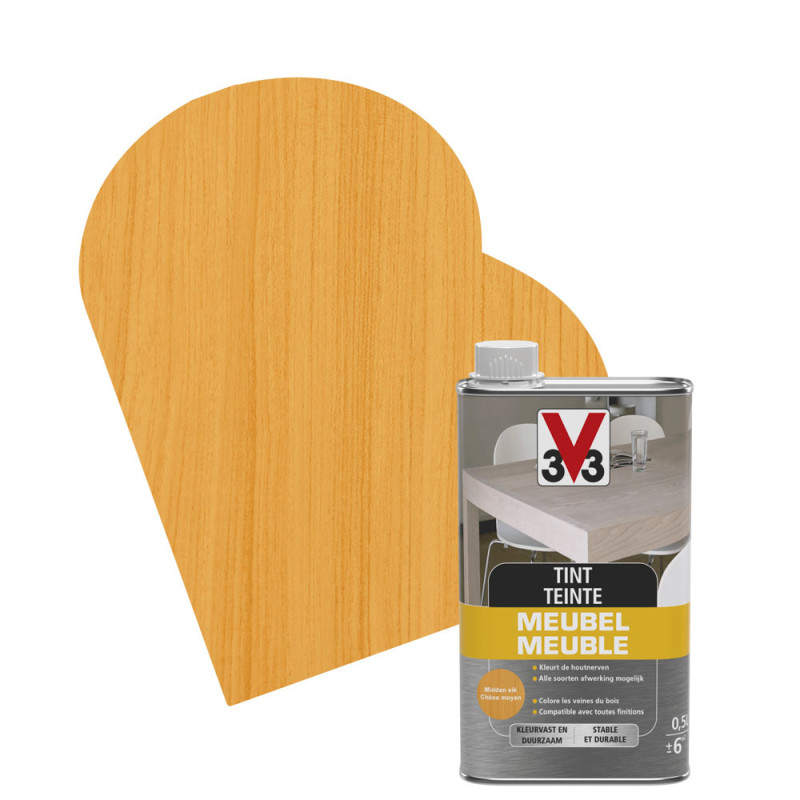 Si vous cherchez une solution efficace pour embellir votre mobilier intérieur, la teinte Meuble Deco de la marque V33 convient parfaitement. Ce produit apporte une jolie coloration en chêne moyen tout en rehaussant la beauté naturelle et le veinage du bois. Prêt à l'emploi, cet élément mat s'applique sur de nombreux bois européens et exotiques, qu'ils soient neufs ou anciens, et est compatible avec tous types de finition.
