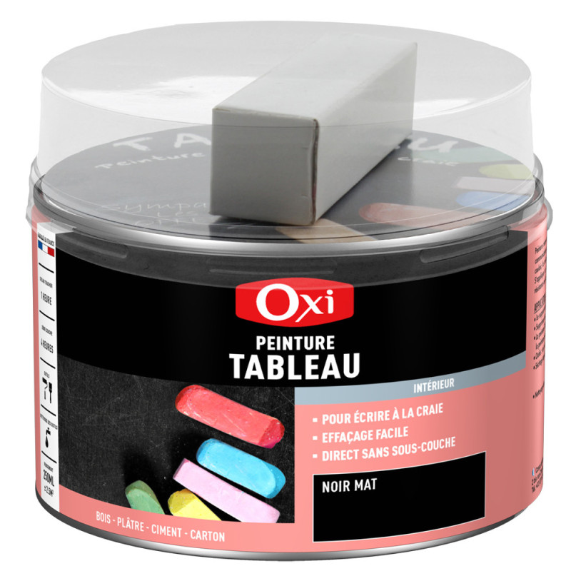 La peinture tableau noir de la marque Oxi est un produit mat de haute résistance qui offre une finition lisse pour créer des surfaces écrivables à la craie sur murs et bois. Son rendement de 10 m²/L et son séchage complet en 4 heures la rendent compatible avec les espaces humides.