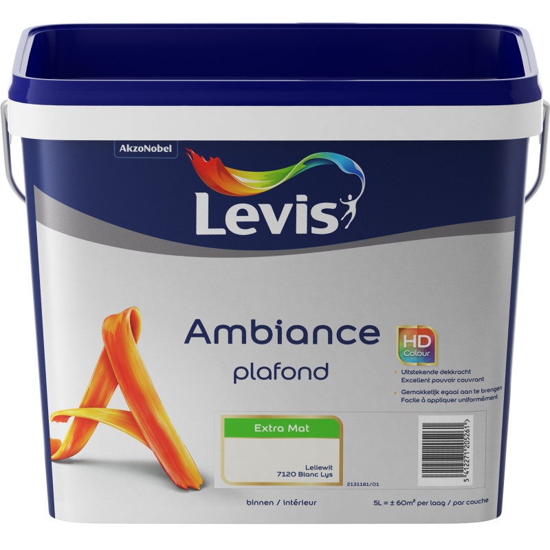 La Peinture plafond Ambiance Blanc lys 5 L LEVIS est une peinture acrylique extra mate idéale pour les plafonds. Elle n'éclabousse pas, masque les imperfections et le film de peinture est très lavable.