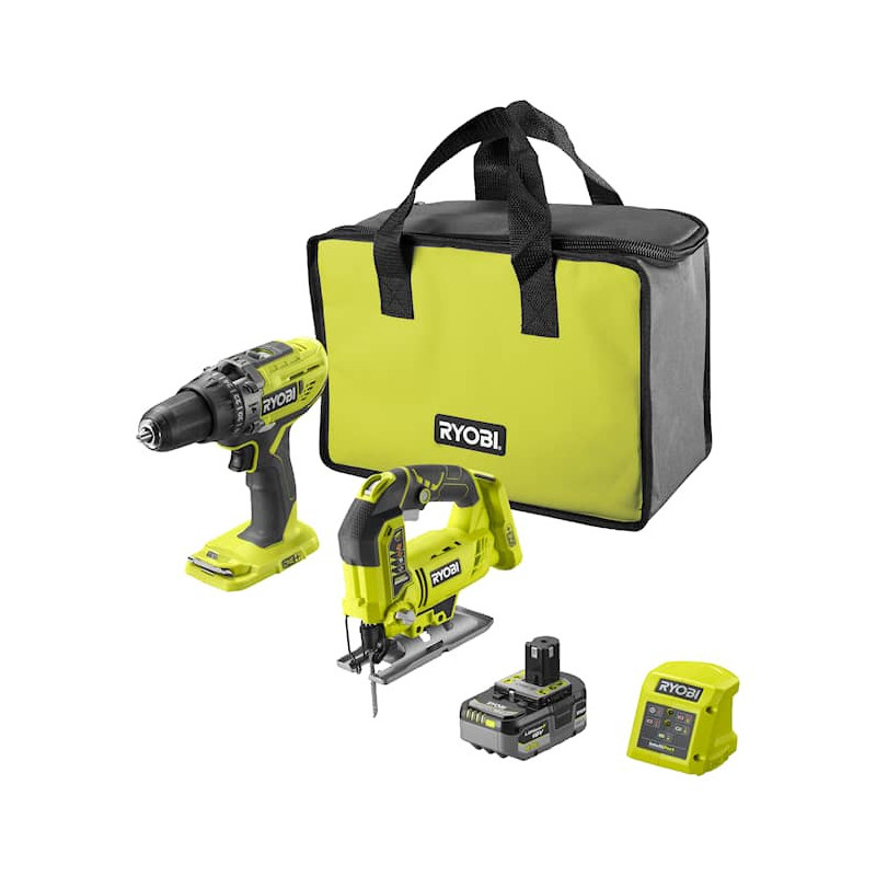 Ce pack One+ 18 V de la marque Ryobi intègre une perceuse-visseuse à variateur de vitesse et deux régimes, ainsi qu'une scie sauteuse, le tout alimenté par une batterie Lithium-Ion 4 Ah. L'ensemble est fourni avec un chargeur et un sac de transport pratique.