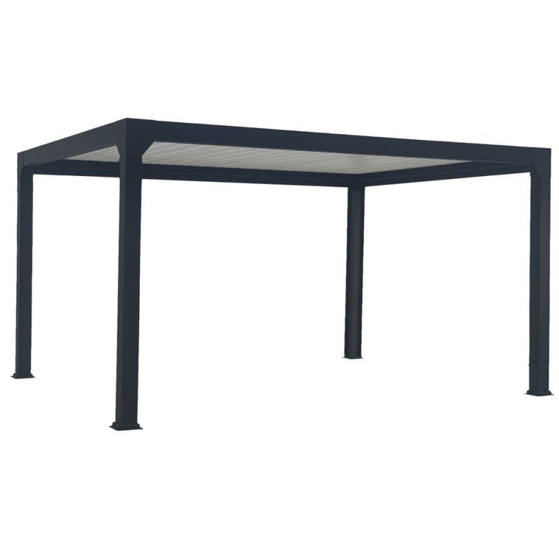 Le toit est équipé de lames orientables en aluminium qui se commandent par télécommande ou interrupteur. Ce système permet de réguler précisément l'ensoleillement et la ventilation sous la structure. En position fermée, les lames assurent une protection complète contre la pluie, tandis qu'ouvertes, elles laissent passer l'air et la lumière naturelle. Une gouttière intégrée assure l'évacuation discrète et efficace des eaux de pluie.