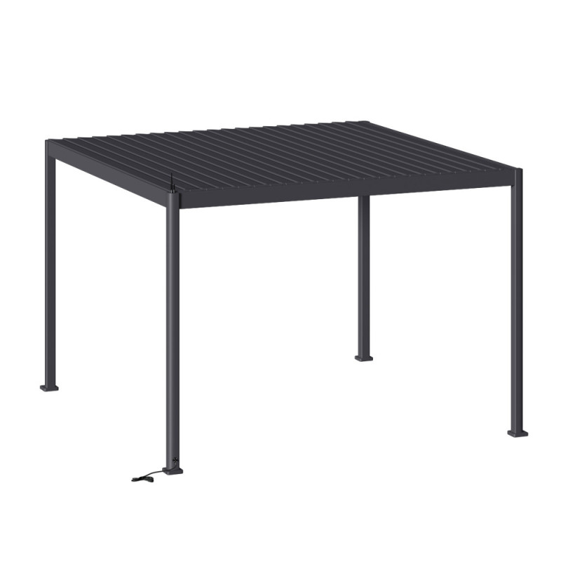 La pergola bioclimatique Evora en aluminium graphite de 3,69 x 3,69 x 2,51 m offre une ouverture électrique des lames orientables par télécommande ou application mobile. Son système d'évacuation des eaux par la base des pieds et sa grande hauteur sous plafond assurent un usage optimal.
