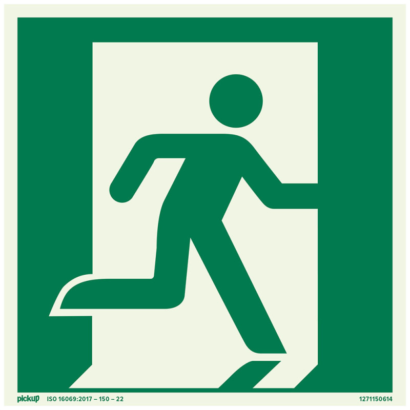Le pictogramme adhésif photoluminescent direction sortie droit de la marque Pickup constitue un élément de signalisation passive essentiel pour la sécurité des personnes. Ce dispositif est conçu pour indiquer de manière claire et immédiate la direction à suivre vers une issue de secours, notamment dans des conditions de visibilité réduite.