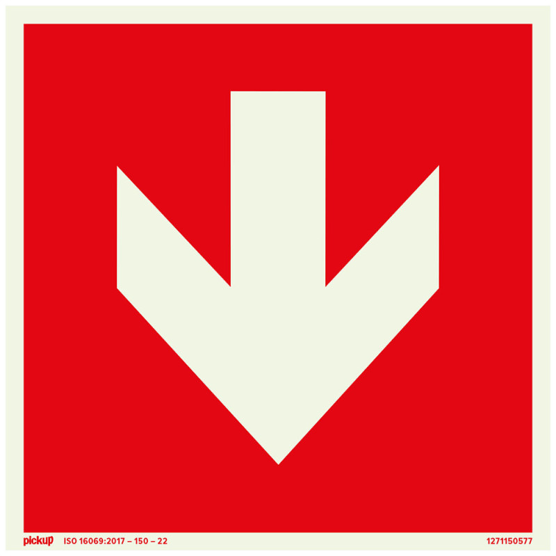 Ce pictogramme adhésif photoluminescent de la marque Pickup, d'un format carré de 15 x 15 cm, intègre une flèche directionnelle rouge sur fond blanc. Sa technologie assure une signalisation directionnelle fiable en cas de faible luminosité, grâce à une fixation permanente par adhésif sur surfaces lisses.