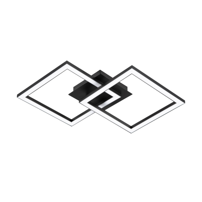 Ce plafonnier LED Palmaves 2 de la marque Eglo présente un design élégant en métal noir, comprenant deux éléments lumineux de forme carrée.