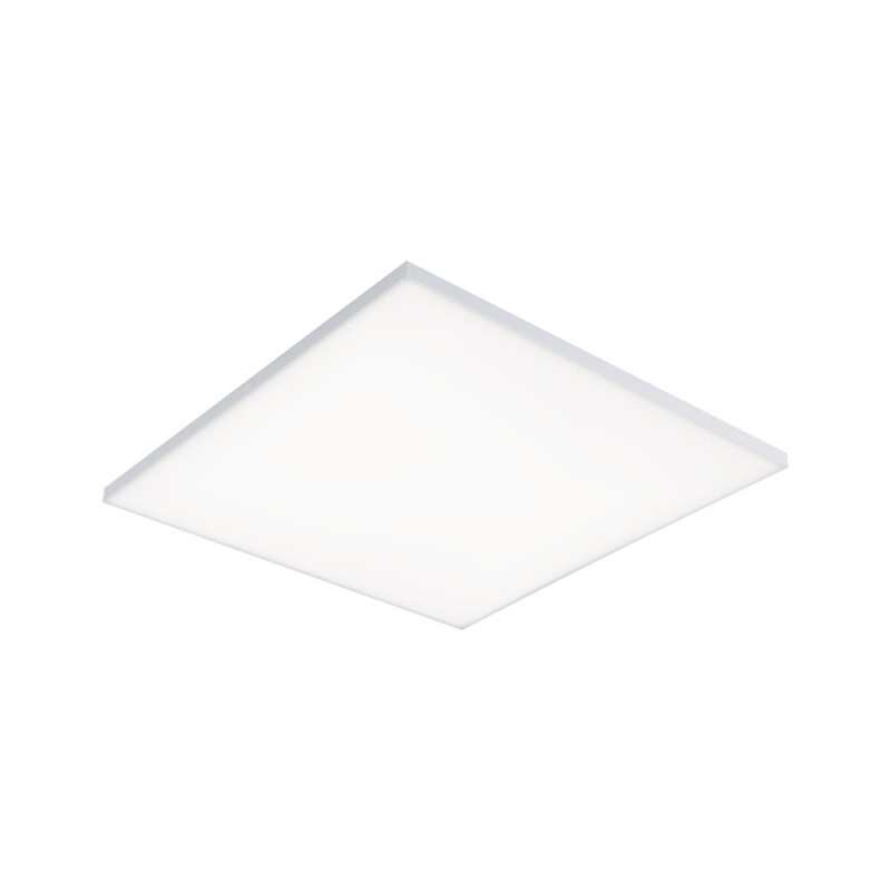Le panneau LED Velora de la marque Paulmann, d'une puissance de 34 W, diffuse une lumière chaleureuse de 3000 K avec un flux lumineux de 3500 lm. Son design sans cadre et ultraplat, en métal blanc, permet une intégration discrète pour un éclairage d'ambiance uniforme en montage mural ou au plafond.