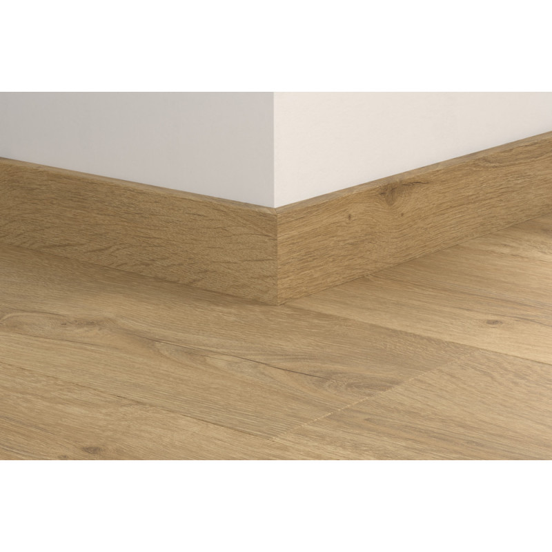 La plinthe PERGO chêne miel naturel, certifiée PEFC, mesure 240 x 5,8 x 1,2 cm. Conçue en MDF avec une surface stratifiée résistante aux rayures, elle assure une correspondance parfaite avec les sols stratifiés. Sa pose est polyvalente : à clipser ou à coller.
