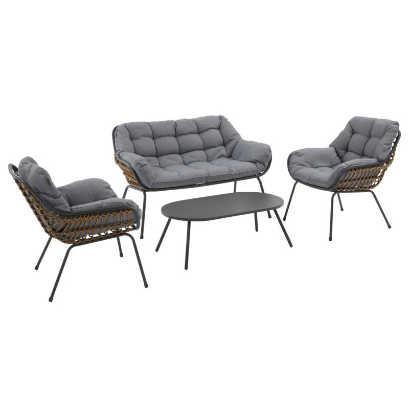 Le salon de jardin Paopao de la marque Hespéride constitue un ensemble fonctionnel et élégant pour aménager un espace de détente en plein air. Il se compose d'un canapé deux places, de deux fauteuils individuels et d'une table basse, offrant ainsi une capacité d'accueil pour quatre personnes. L'ensemble présente une teinte graphite, une nuance de gris sobre et intemporelle qui s'intègre avec aisance dans divers environnements.