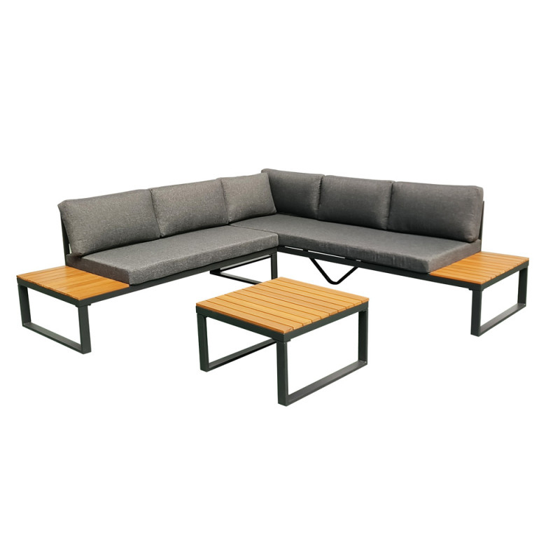 L'assise est équipée de coussins rembourrés, fournis avec l'ensemble. Le tissu de ces coussins est en polyester filé d'une densité de 200 g/m², offrant une surface agréable au toucher. La teinte gris foncé des textiles s'associe harmonieusement avec les éléments en finition bois, créant une palette contemporaine et intemporelle.