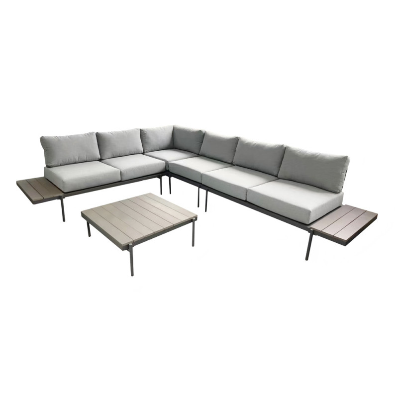 Le salon d'angle de jardin Antoine est un ensemble complet en aluminium comprenant un canapé d'angle, deux canapés droits et une table basse au plateau en polywood. Il offre six places assises avec des coussins en polyester filé de 180 g/m², d'entretien facile.