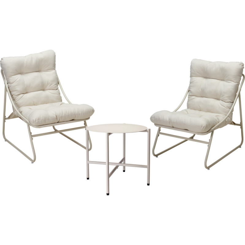 Le salon de jardin beige 3 pièces se compose d'une table en acier et de deux fauteuils relaxants avec leurs coussins. Sa structure métallique au revêtement poudre crème et son tissu polyester offrent robustesse et confort pour l'extérieur.