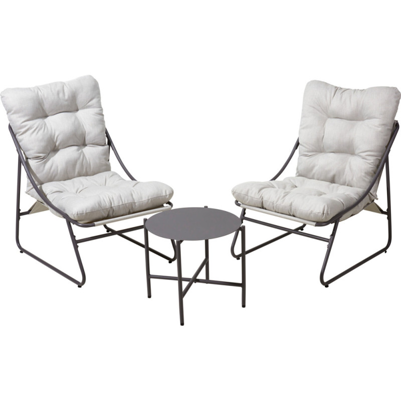 Le salon de jardin gris 3 pièces se compose d'une table en acier et de deux fauteuils relaxants avec leurs coussins. Sa structure métallique au revêtement poudre gris foncé et son tissu polyester gris clair assurent une robustesse et un confort adaptés aux espaces extérieurs.
