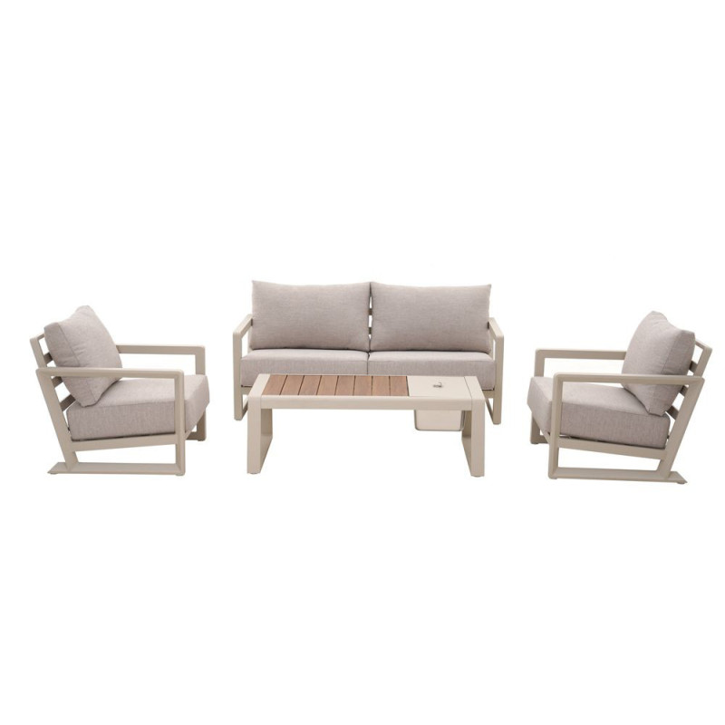 La structure de chaque élément de ce salon de jardin est fabriquée en aluminium, un matériau reconnu pour sa légèreté et sa résistance à la corrosion. Cet alliage est ensuite recouvert d'une peinture époxy de couleur crème, assurant une finition lisse et durable. L'alliance de l'aluminium et du textile des coussins confère à l'ensemble une esthétique à la fois moderne et chaleureuse, propice à la création d'un coin salon extérieur accueillant.