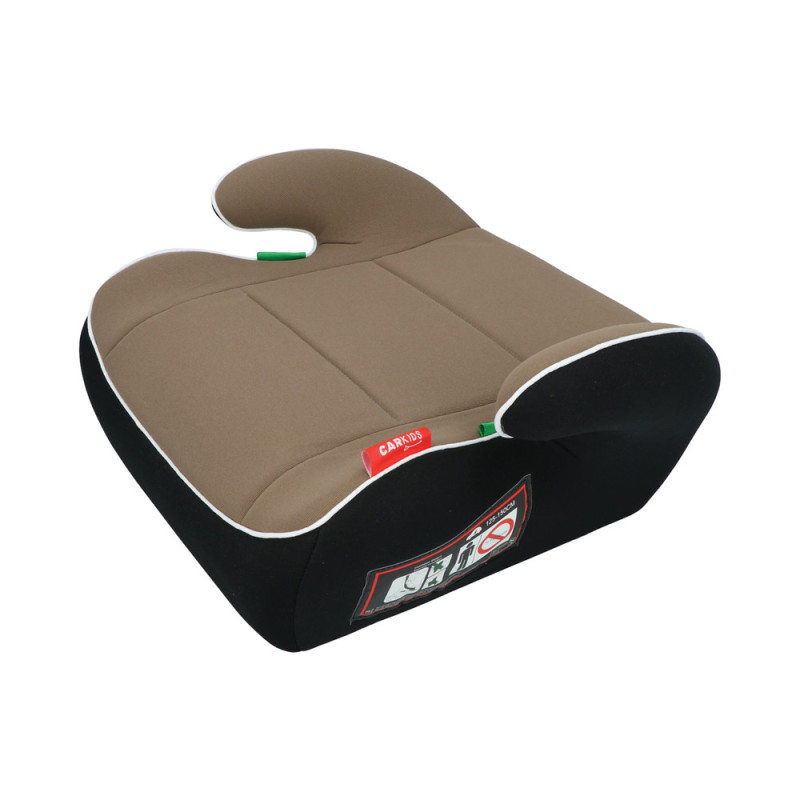 Le réhausseur i-Size Sam de la marque Carkids, d'une teinte taupe et noir, est homologué selon la norme R-129 et convient aux enfants mesurant entre 125 et 150 cm. Son installation est flexible sur les sièges avant ou arrière, et sa housse amovible se nettoie facilement.