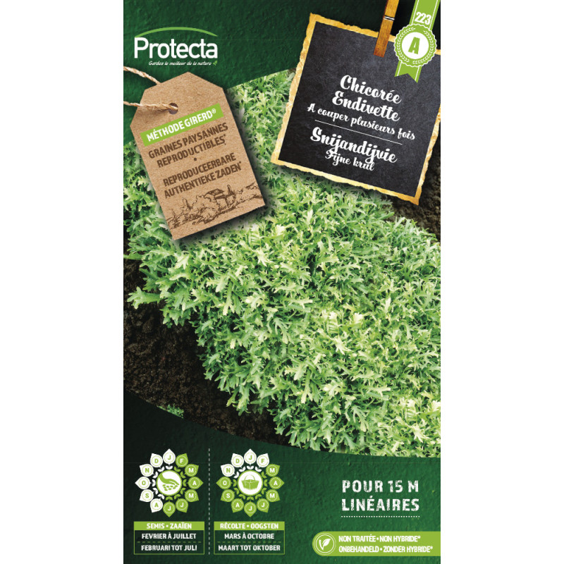 Les semences de chicorée Endivette PROTECTA produisent une salade à couper très frisée, aux feuilles tendres et vert clair. Le semis dru en lignes permet une récolte précoce des jeunes pousses au printemps.